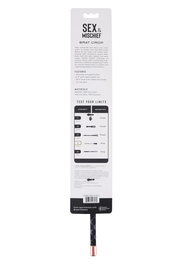 Take command and show your brat who’s in charge with the Brat Crop! Ramp up your play with subtle taps, playing with sensations across their body with the split tipped rose gold vegan leather before inflicting an intense smack with a satisfying snap. Perfectly crafted to extend your reach for sensual impact play in a stylish and captivating display of dominance.